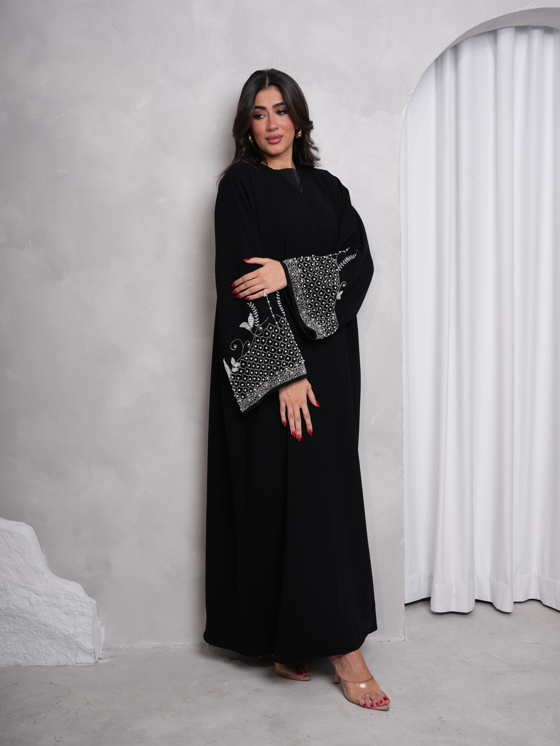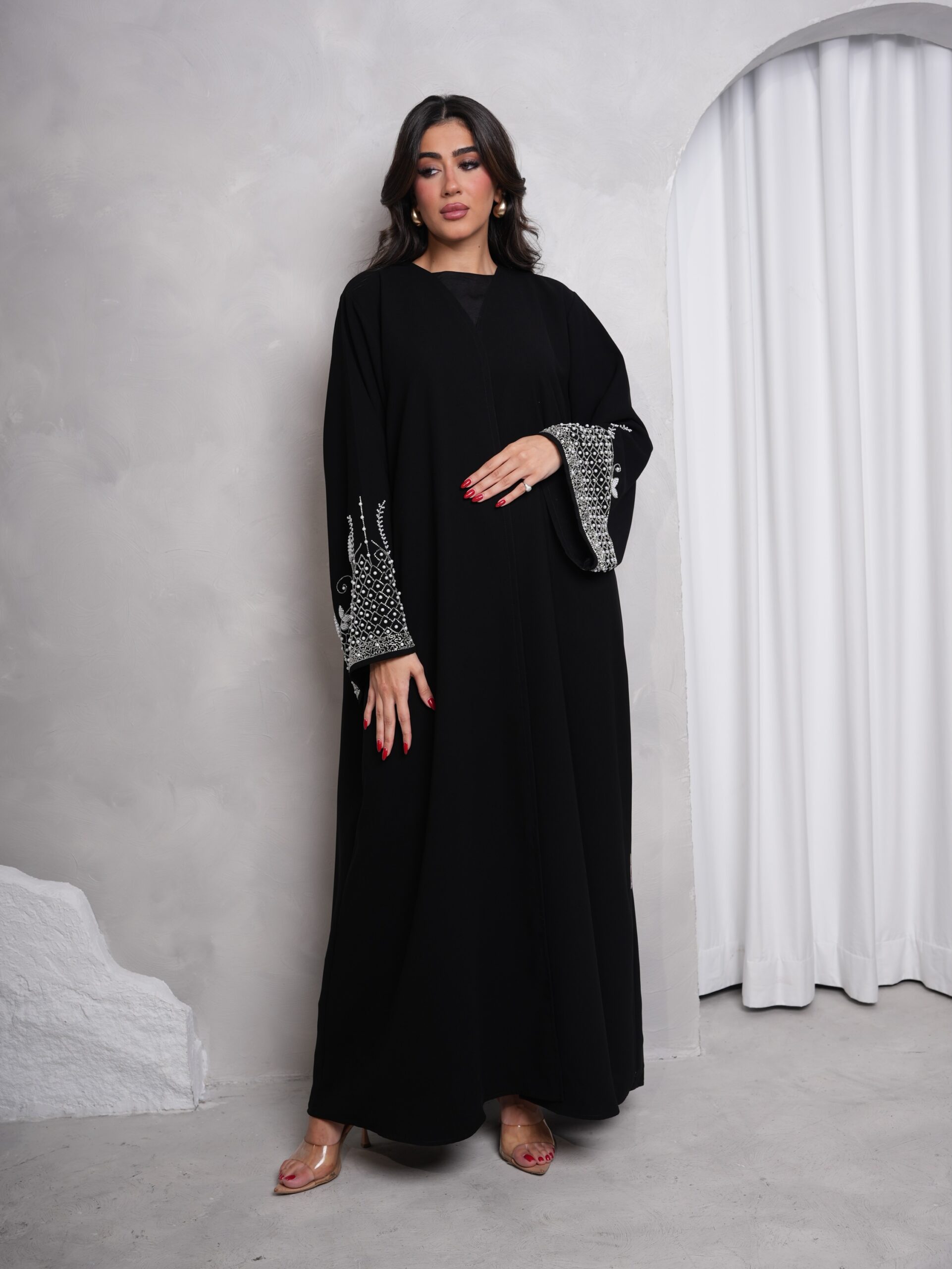 عباية بقماش كوبا اسود مميزة بالشك بالكريستال واللولو الابيض
