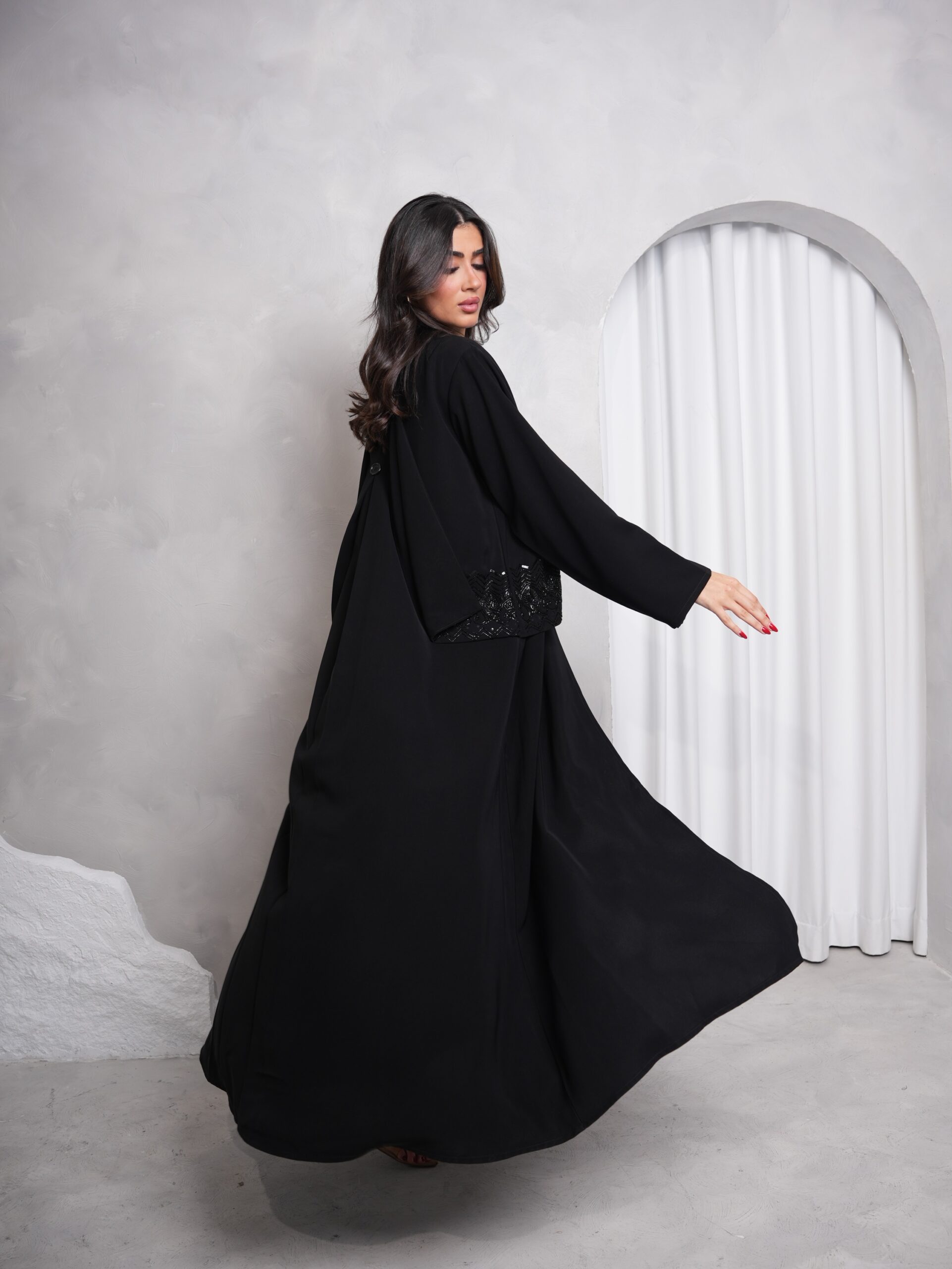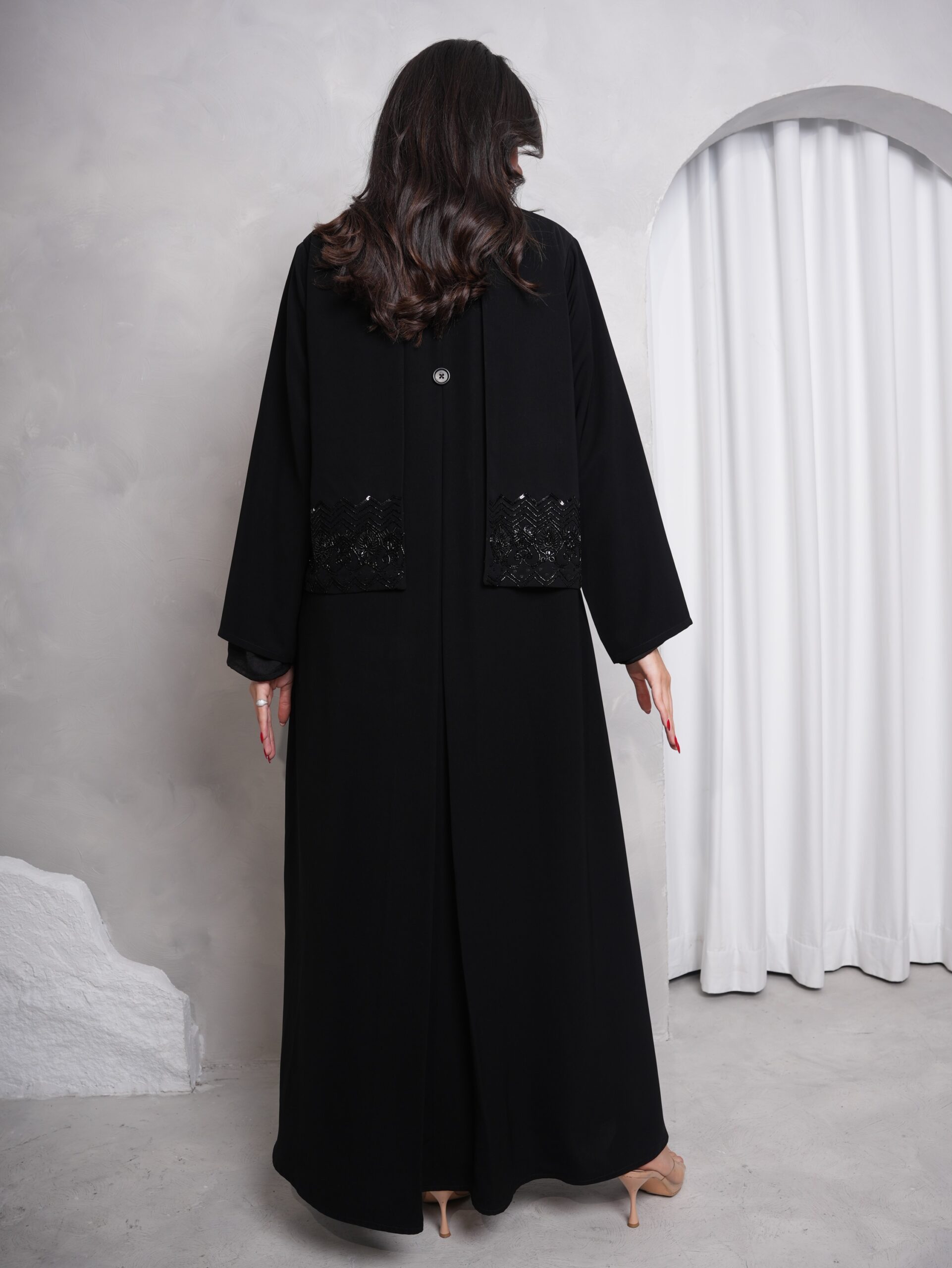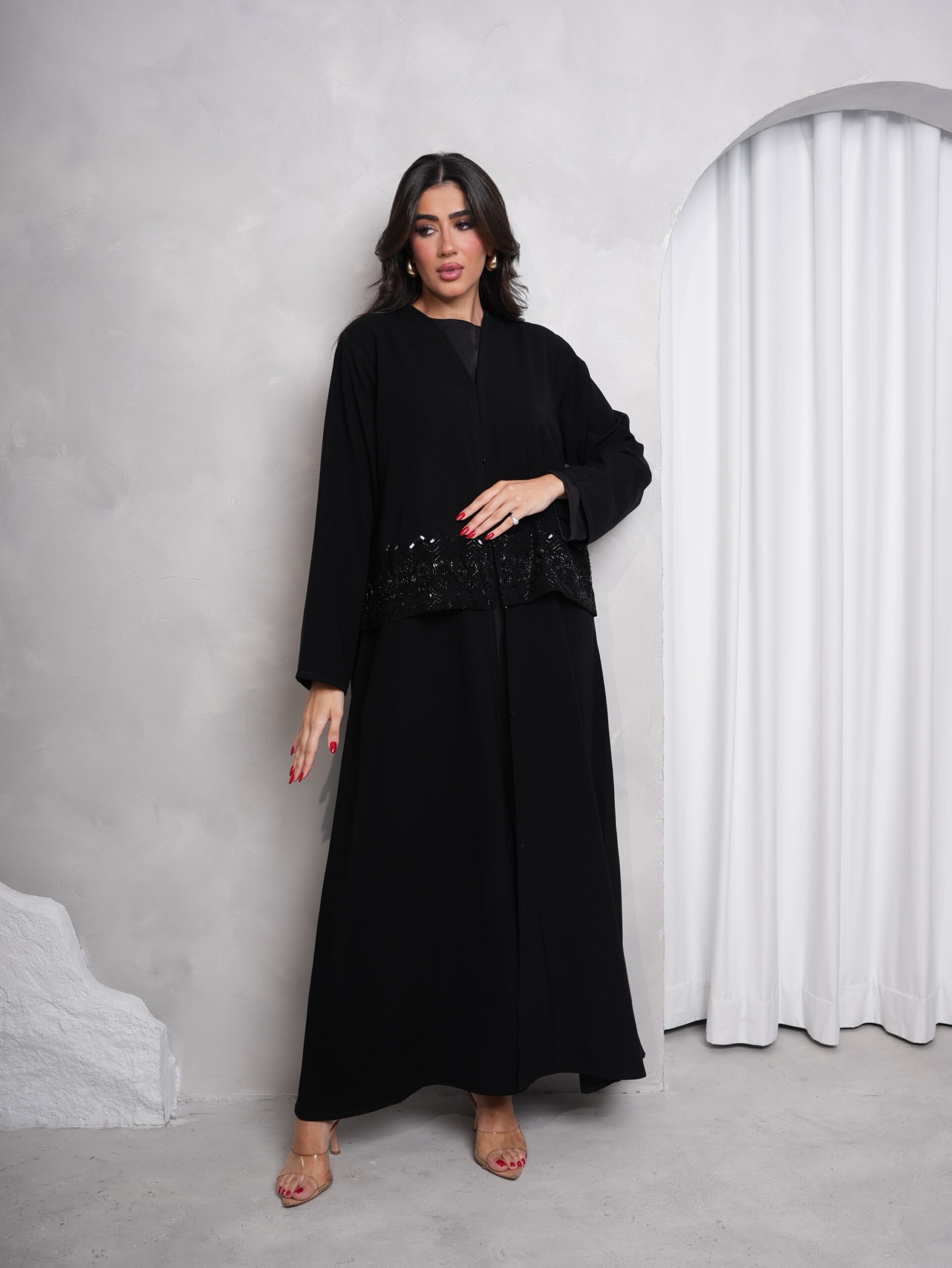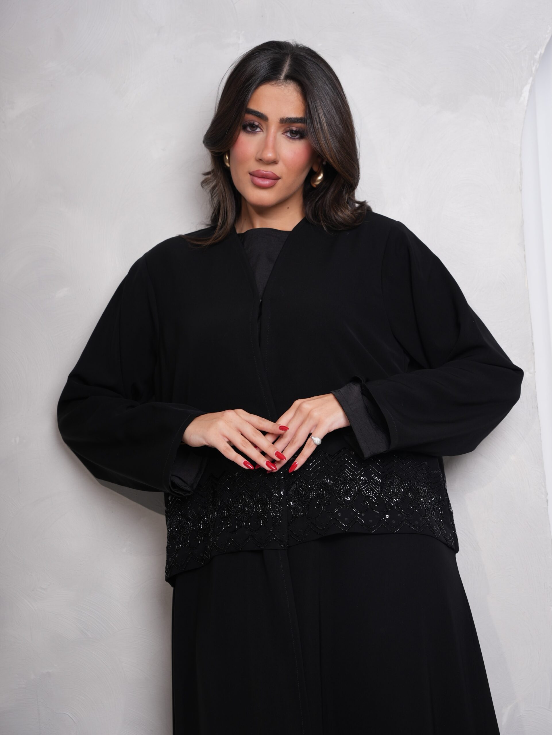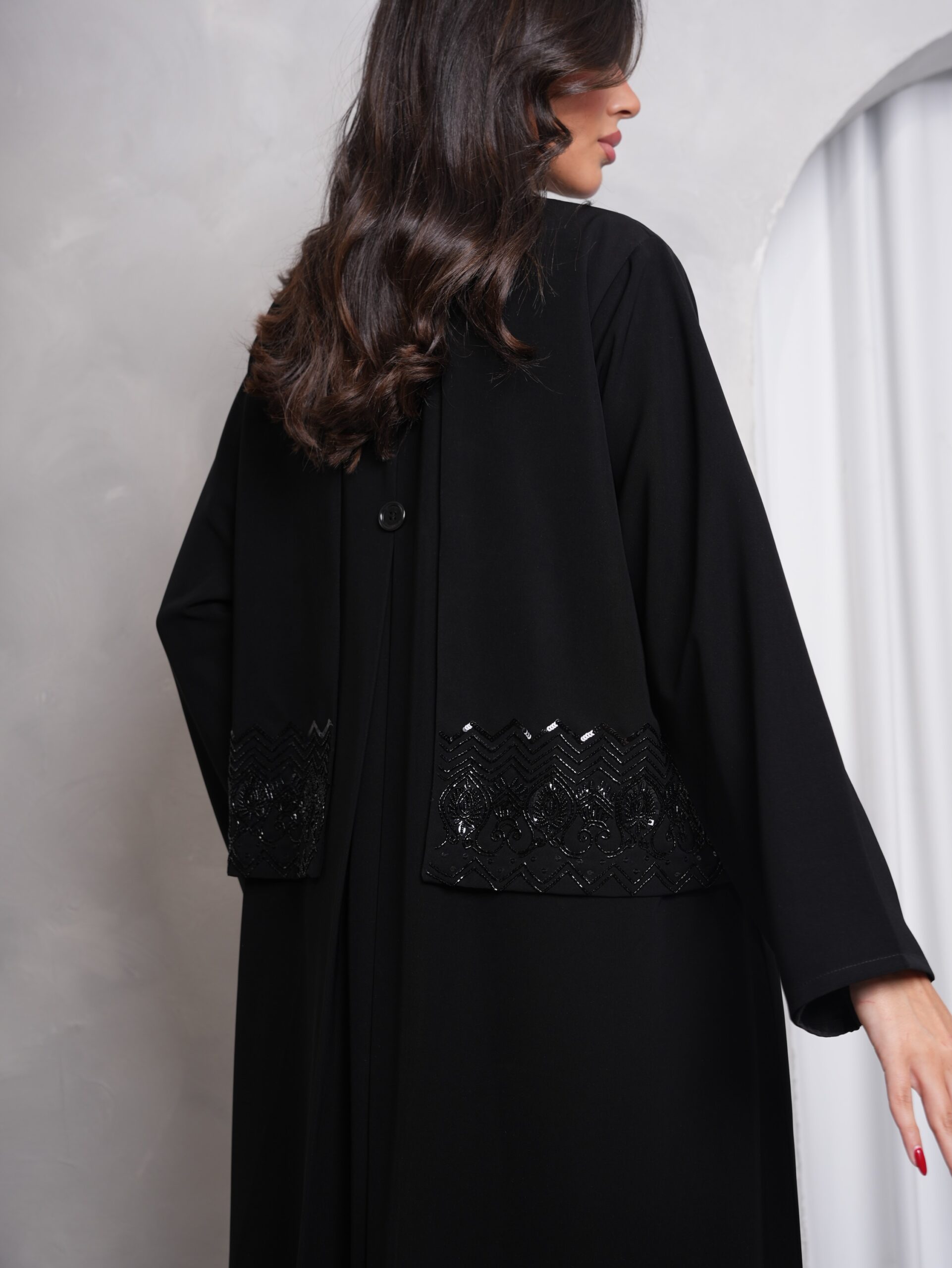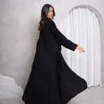 عباية بقماش كريب اندونيسي عالي الجودة بلون اسود فاحم ، مميزة بشك الخرز باللون الاسود على الصدر والظهر ، قصتها نص كلوش
