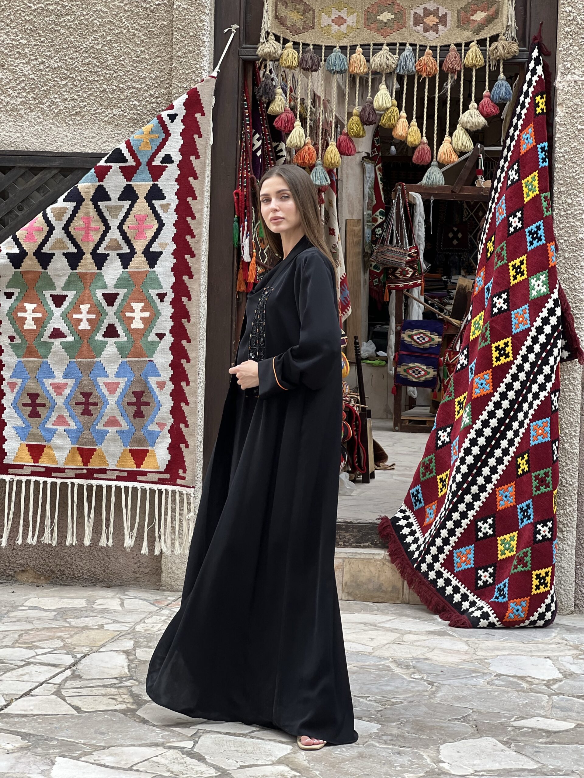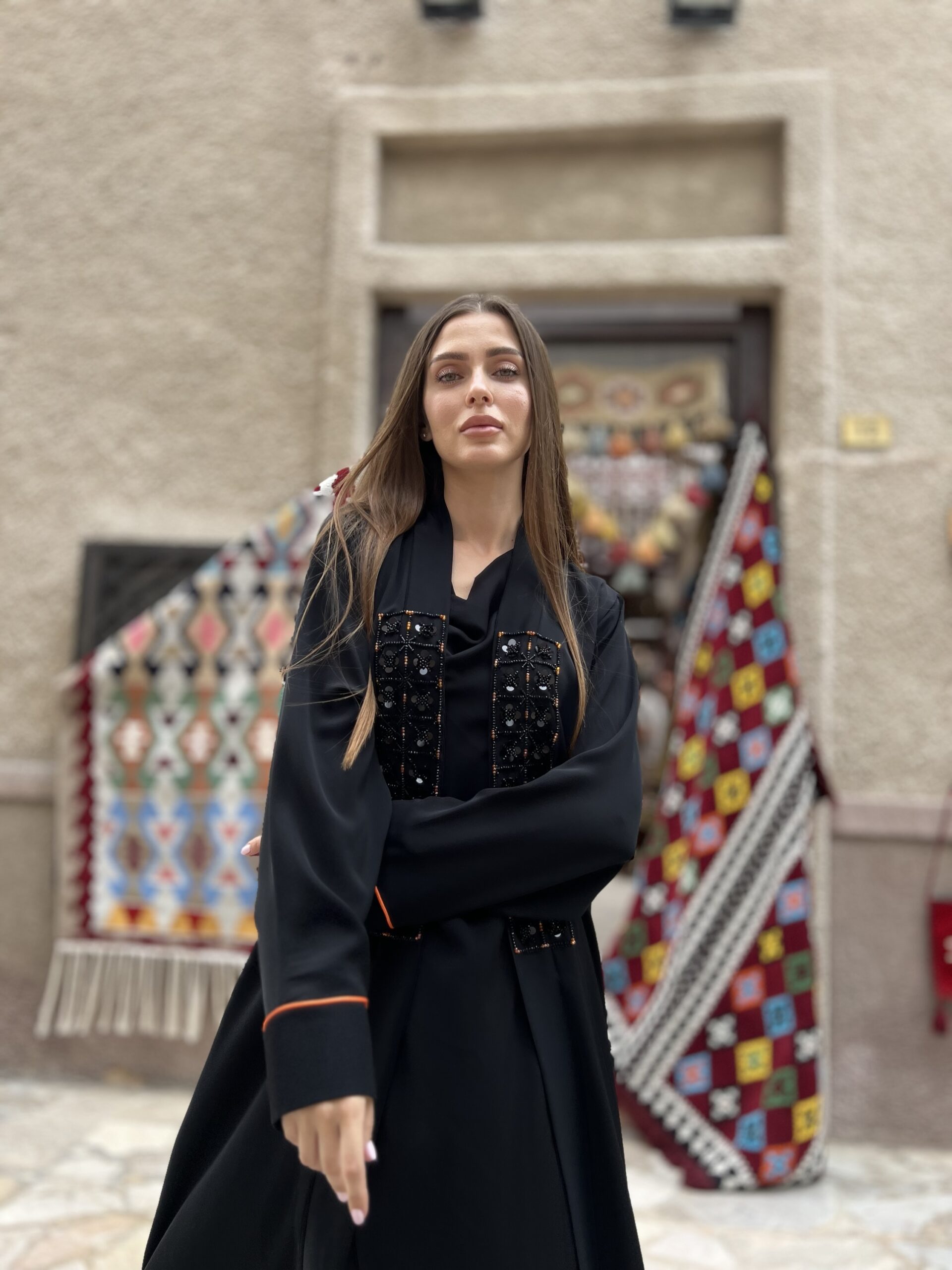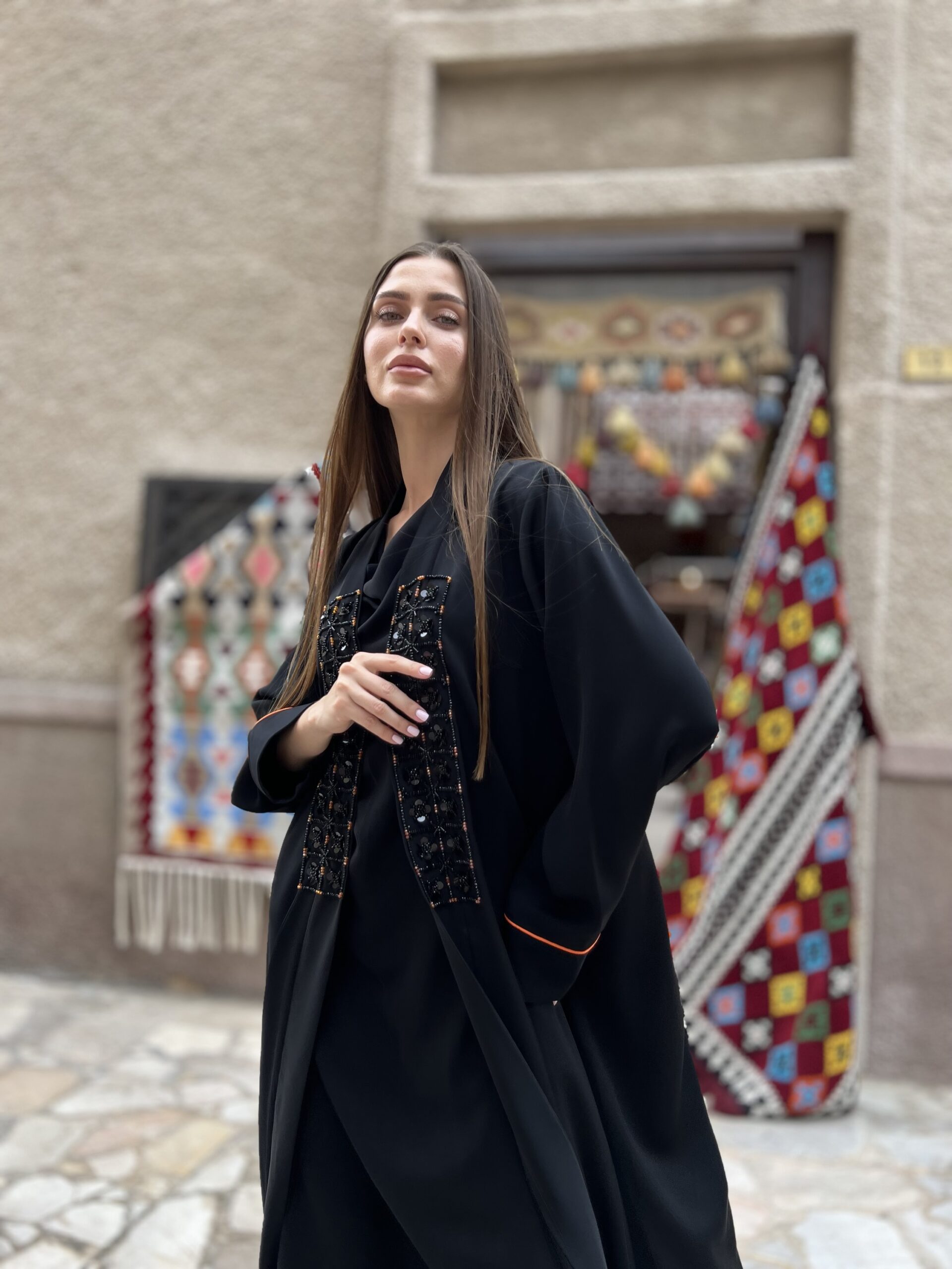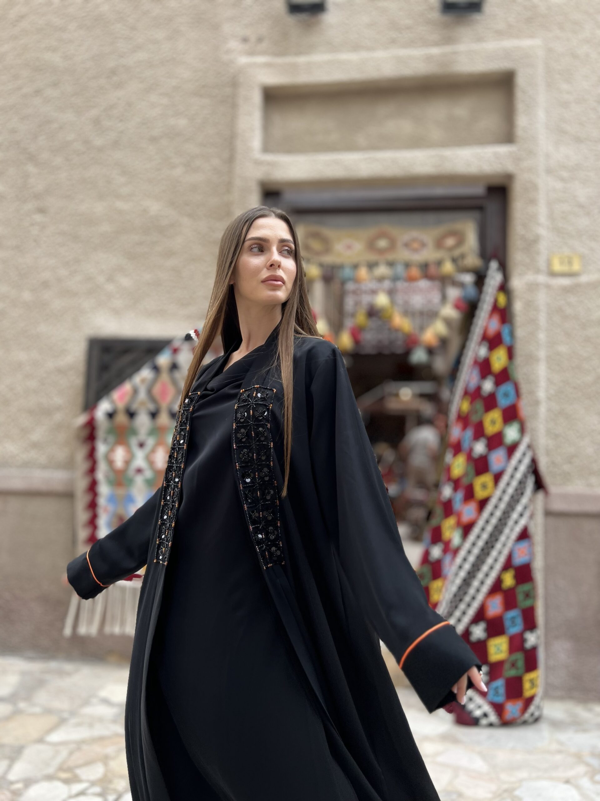 عباية بقماش ندى اسود مع تفاصيل بالخرز بلون برتقالي ممكن تغيير لون الخرز