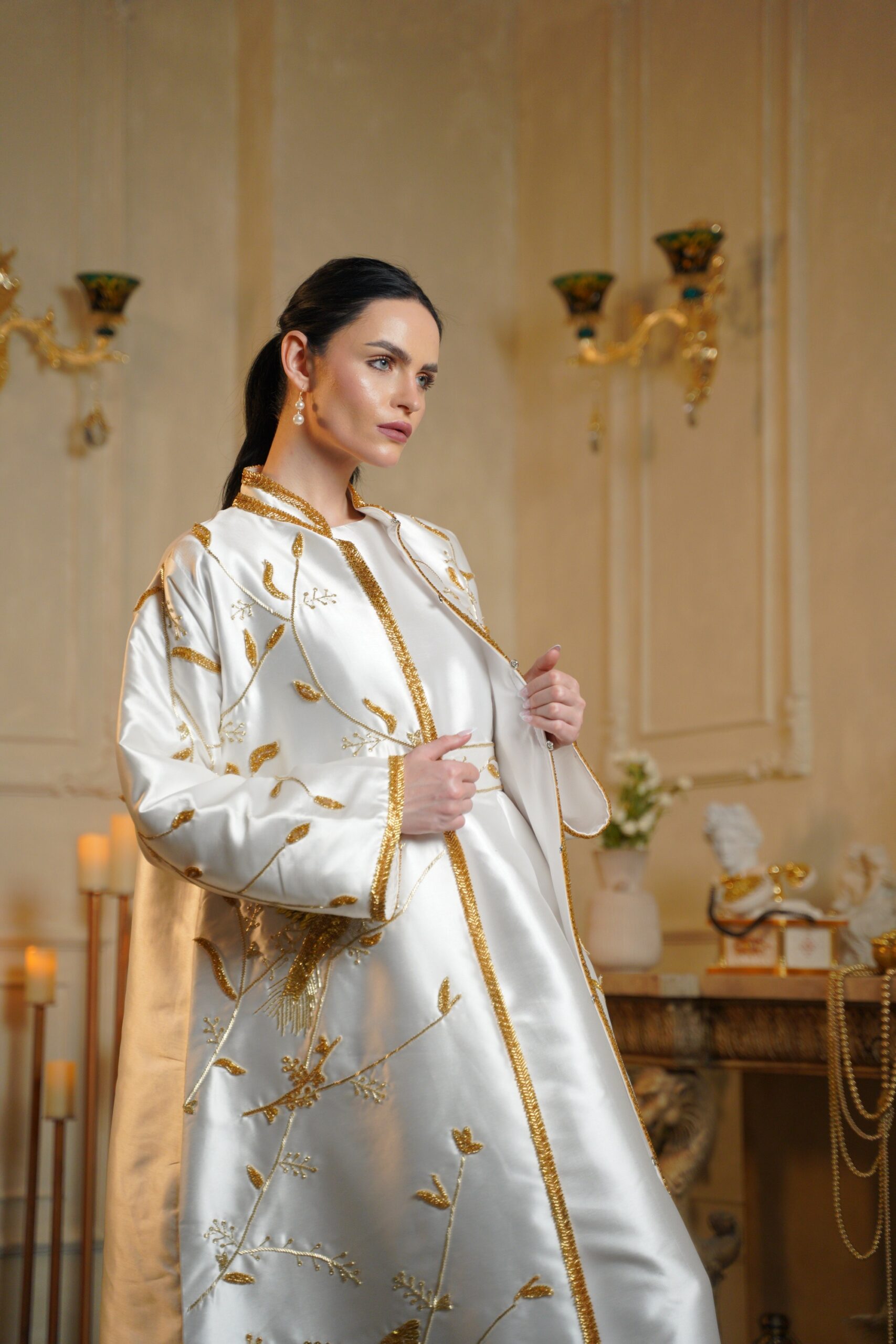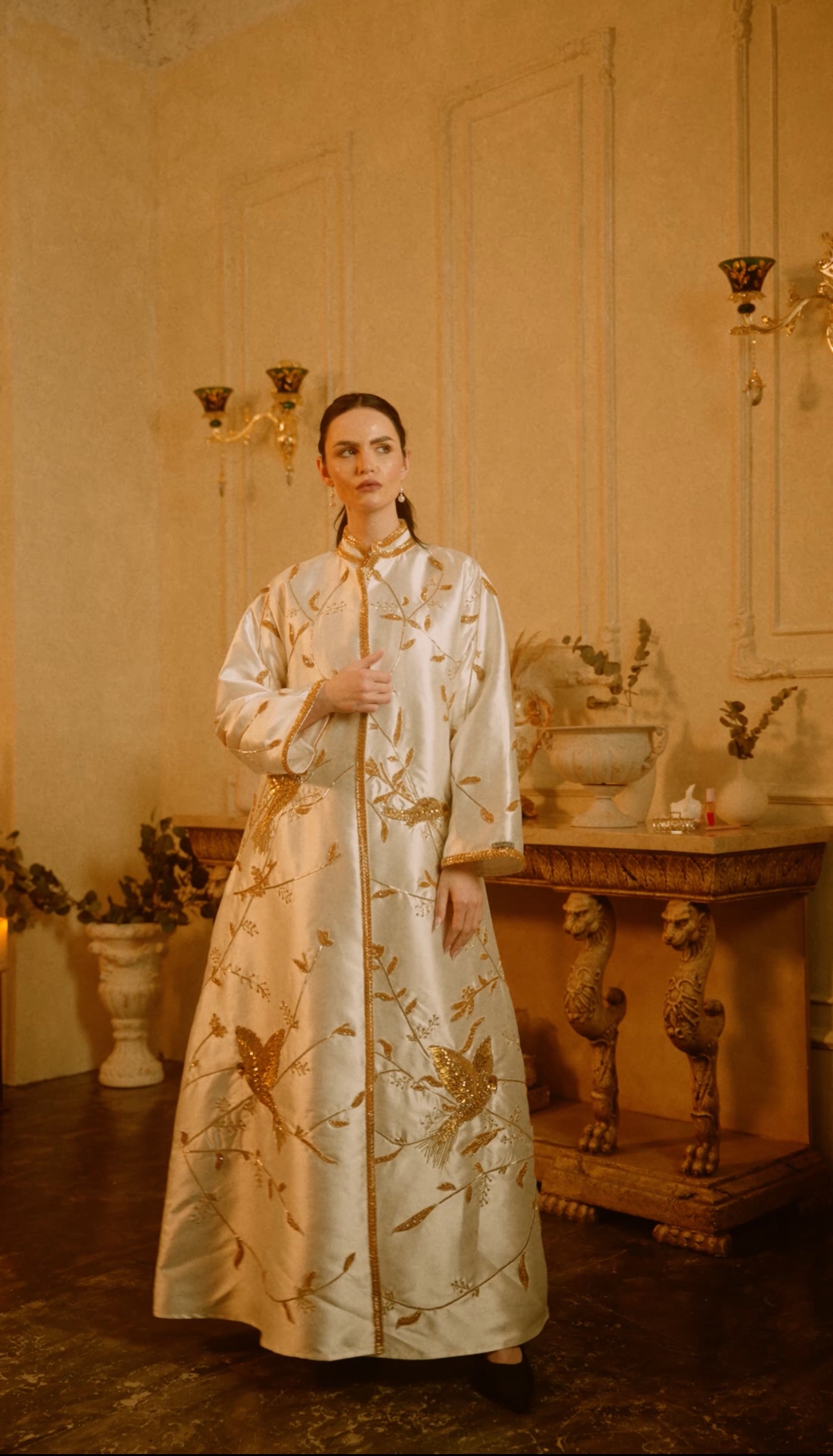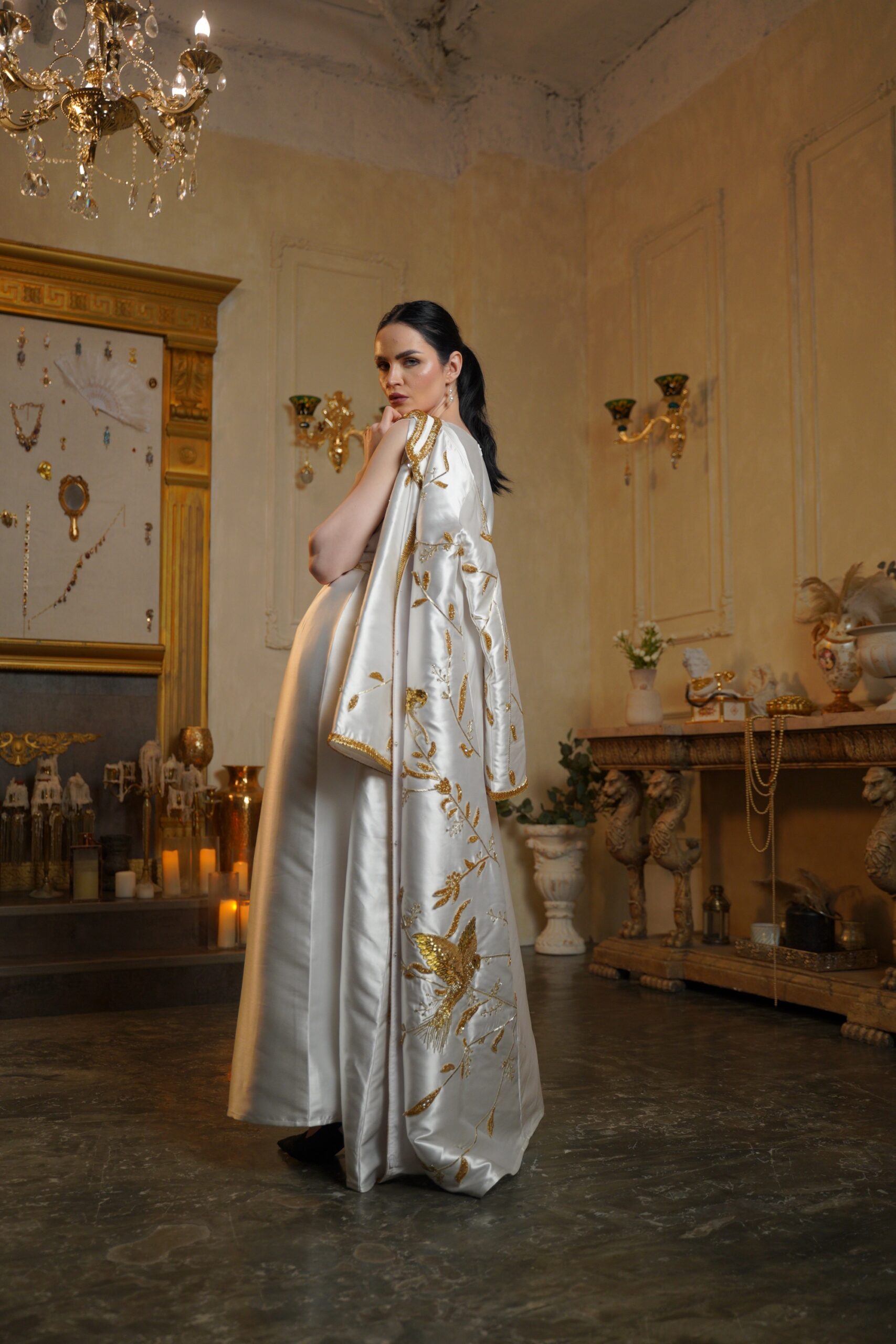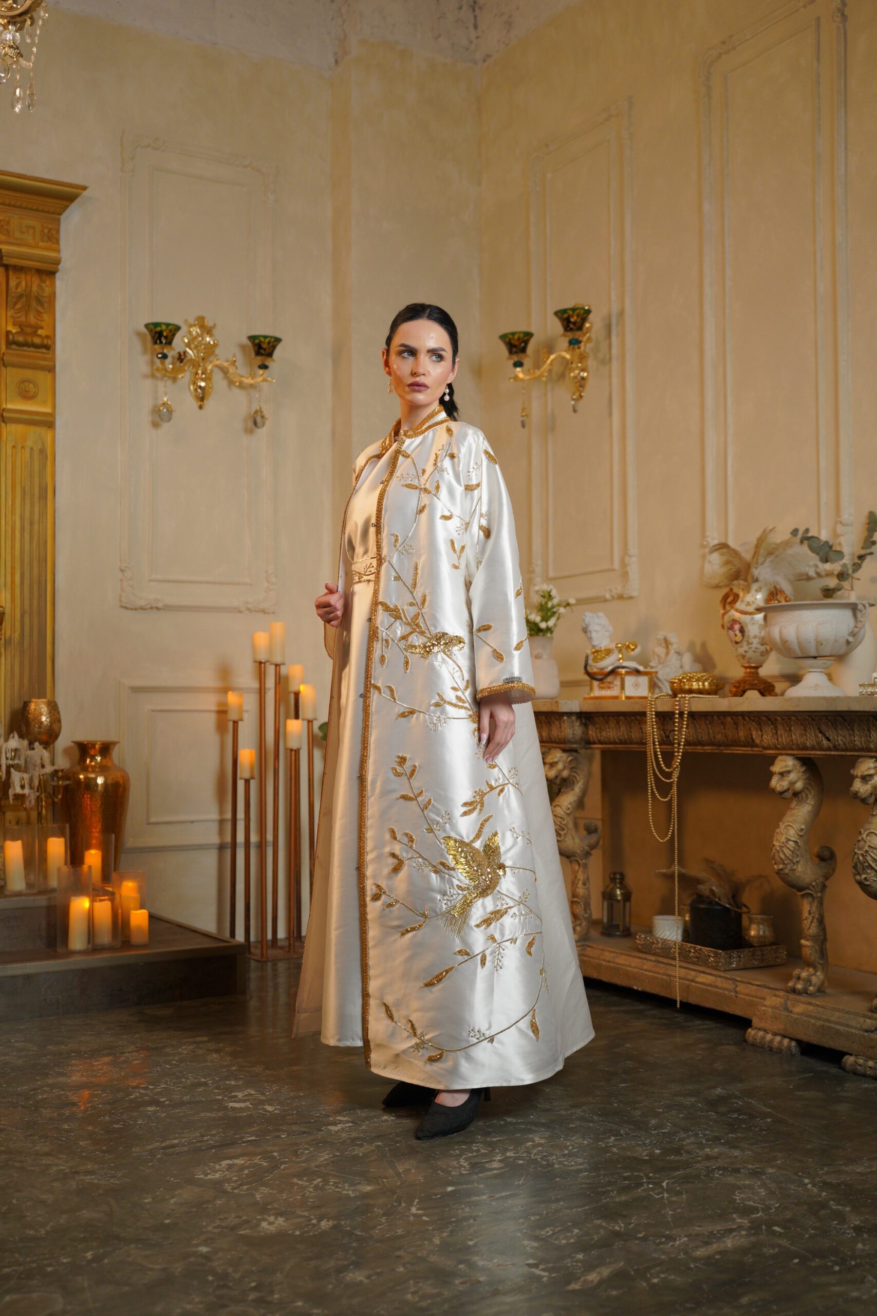 تصميم فاخر مستوحى من الطبيعة، يتميّز بتطريز ذهبي يدوي كثيف،