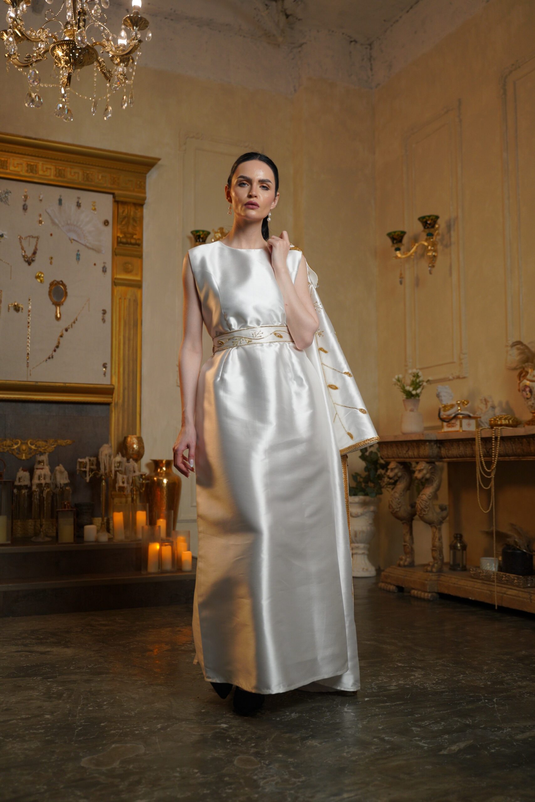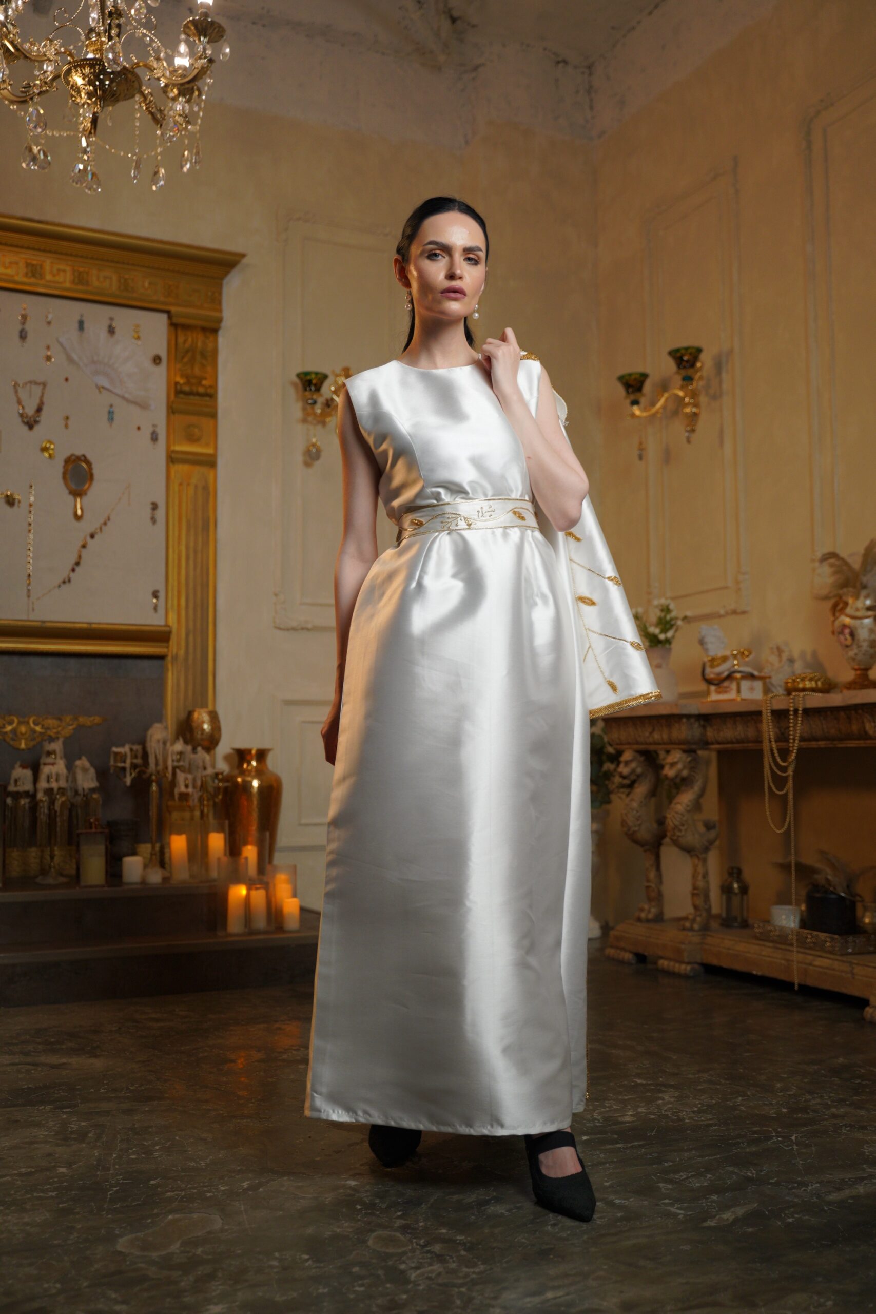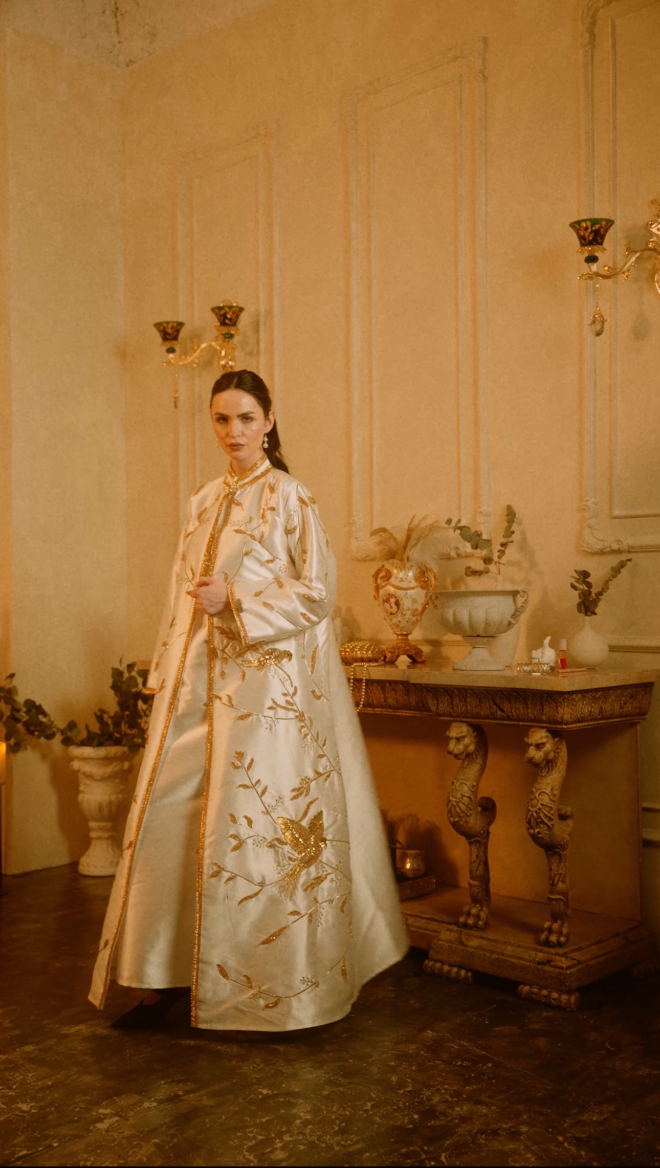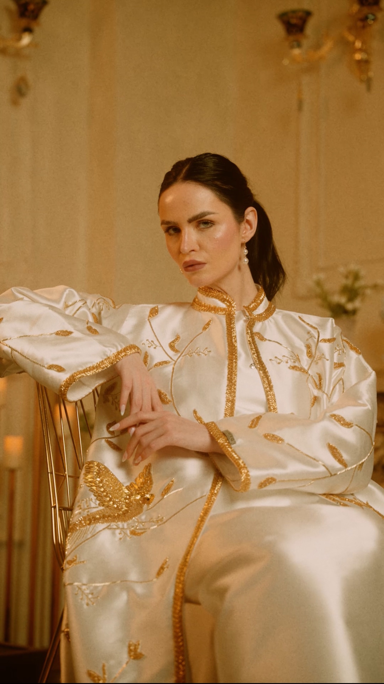 تصميم فاخر مستوحى من الطبيعة، يتميّز بتطريز ذهبي يدوي كثيف،